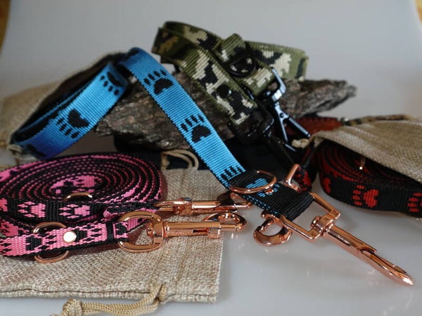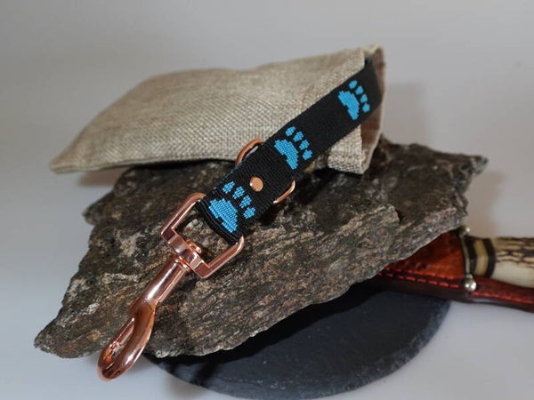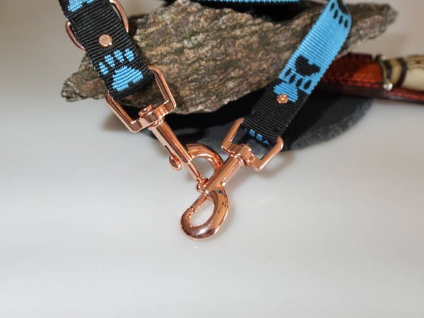 Wenn Du und dein Hund gemeinsam unterwegs seid, braucht ihr eine Leine, die sich bequem trägt und die zwischendurch auch mal schnell in der Jackentasche verschwinden kann. Die Gurtgewebeleine, bietet genau diese Eigenschaften und kann gleich doppelt in der Länge verstellt werden, sodass ihr auf alle Situationen und Umgebungen perfekt vorbereitet seid. Dank der Witterungsbeständigkeit des Materials, hat diese eine lange Lebensdauer und hält auch einer intensiven Beanspruchung stand. Die tolle Farbgebung und Muster verleiht dem Hunde-Accessoire einen zeitlosen Charme. Wenn du einen einheitlichen Look zusammenstellen möchtest, lässt sich das farblich passenden Halsband dazu anfertigen. Wie bei all meinen Produkten, achte ich auf Qualität meiner Zukaufteile und darauf, dass der Hersteller Technische Datenblätter zu Verfügung stellt. So kann ich mein gutes Gefühl der Haltbarkeit meiner Produkte an euch weitergeben. Wie hier, dieses Gurtband hat eine Bruchlast von 400Kg, die Karabiner in Rosegold sind mit einer Zugfestigkeit von 166Kg angegeben. Die D-Ringe mit 180 Kg. Die Einschlaufungen der Haken und Ringe sichere ich mit Schrauben und vernähen die Anschlagteile mit einem Nylonfaden.