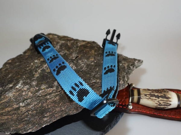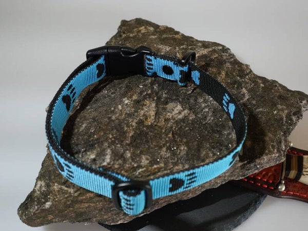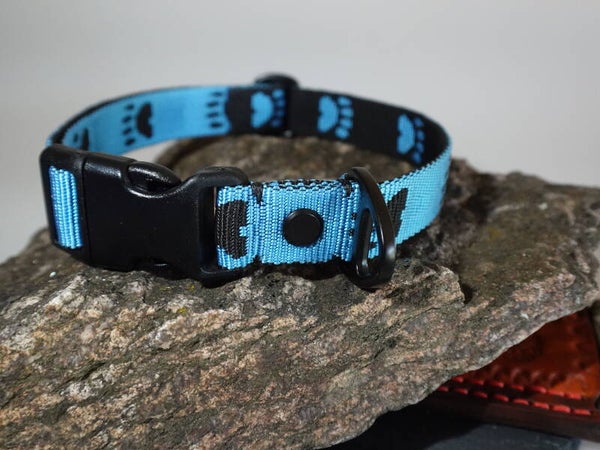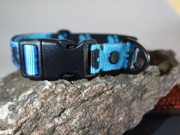 Kundenspezifische Hundehalsbänder aus Gurtband mit Motiv – Blau / Schwarz / Pfoten 20mm breit.