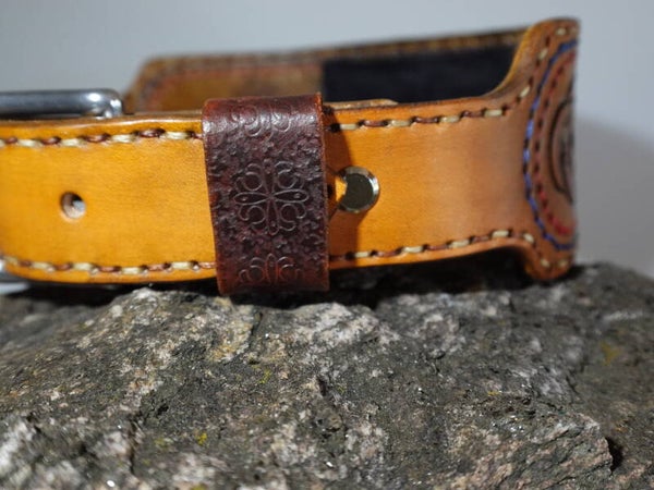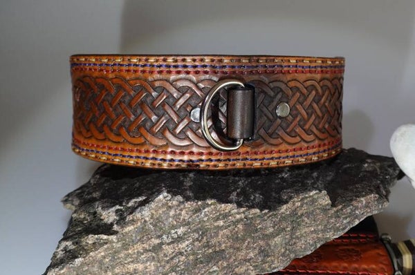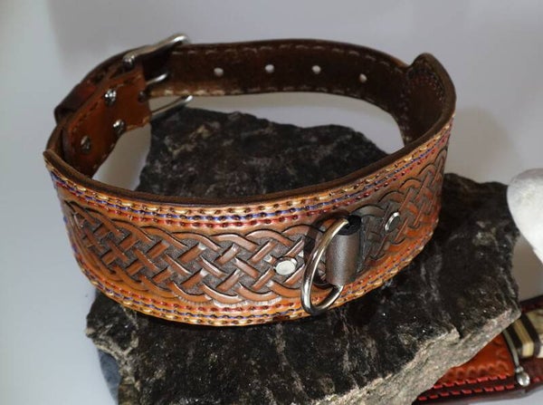Hier ein Halsband aus 3 cm breitem und 4mm dickem Rinderleder. Aufgebrachte Muster werden mit Punziereisen in das nasse Leder eingeschlagen. Beschriftungen auf dem Leder erstelle ich am Computer und mit einem CO2-Laser werden die Beschriftung, Muster, zum Teil auch Bilder in das Leder eingebrannt. Halsbänder für größere und schwerere Hunde nähe ich dann noch von Hand mit einem dicken Nähgarn rundum ab. Damit wird die Festigkeit des Halsbandes erhöht und die Form lässt sich so auch besser lange halten. Anschlageteile wie Dornschließe (Gürtel-schnalle) und D-Ringe beziehe ich von einem Hersteller für Pferdegeschirre. Hier bin ich mir dann auch sicher, dass diese Artikel die Belastung aushalten.