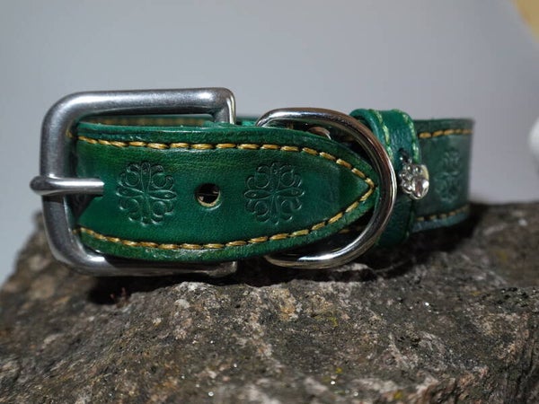Hier ein Halsband aus 3 cm breitem und 4mm dickem Rinderleder. Aufgebrachte Muster werden mit Punziereisen in das nasse Leder eingeschlagen. Beschriftungen auf dem Leder erstelle ich am Computer und mit einem CO2-Laser werden die Beschriftung, Muster, zum Teil auch Bilder in das Leder eingebrannt. Halsbänder für größere und schwerere Hunde nähe ich dann noch von Hand mit einem dicken Nähgarn rundum ab. Damit wird die Festigkeit des Halsbandes erhöht und die Form lässt sich so auch besser lange halten. Anschlageteile wie Dornschließe (Gürtel-schnalle) und D-Ringe beziehe ich von einem Hersteller für Pferdegeschirre. Hier bin ich mir dann auch sicher, dass diese Artikel die Belastung aushalten.