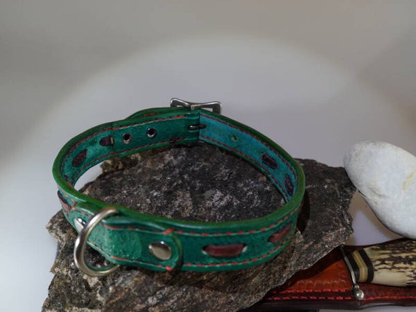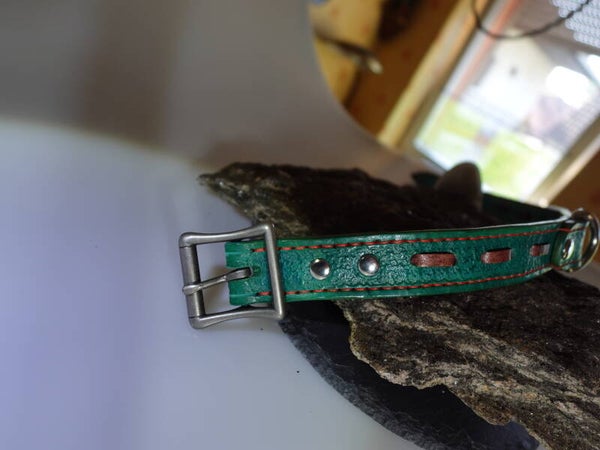 Hier ein Halsband aus 3 cm breitem und 4mm dickem Rinderleder. Aufgebrachte Muster werden mit Punziereisen in das nasse Leder eingeschlagen. Beschriftungen auf dem Leder erstelle ich am Computer und mit einem CO2-Laser werden die Beschriftung, Muster, zum Teil auch Bilder in das Leder eingebrannt. Halsbänder für größere und schwerere Hunde nähe ich dann noch von Hand mit einem dicken Nähgarn rundum ab. Damit wird die Festigkeit des Halsbandes erhöht und die Form lässt sich so auch besser lange halten. Anschlageteile wie Dornschließe (Gürtel-schnalle) und D-Ringe beziehe ich von einem Hersteller für Pferdegeschirre. Hier bin ich mir dann auch sicher, dass diese Artikel die Belastung aushalten.
