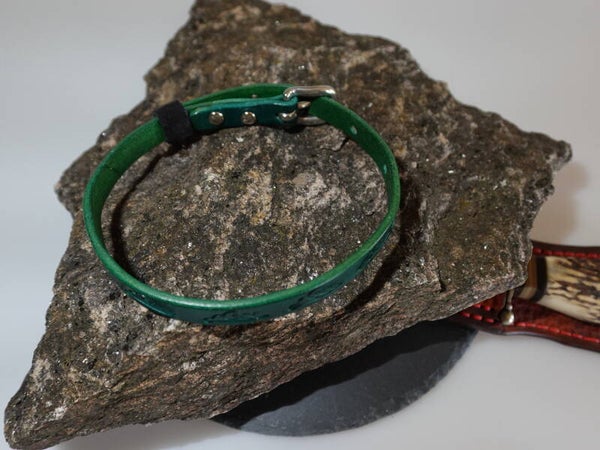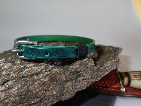 Hier ein Halsband aus 3 cm breitem und 4mm dickem Rinderleder. Aufgebrachte Muster werden mit Punziereisen in das nasse Leder eingeschlagen. Beschriftungen auf dem Leder erstelle ich am Computer und mit einem CO2-Laser werden die Beschriftung, Muster, zum Teil auch Bilder in das Leder eingebrannt. Halsbänder für größere und schwerere Hunde nähe ich dann noch von Hand mit einem dicken Nähgarn rundum ab. Damit wird die Festigkeit des Halsbandes erhöht und die Form lässt sich so auch besser lange halten. Anschlageteile wie Dornschließe (Gürtel-schnalle) und D-Ringe beziehe ich von einem Hersteller für Pferdegeschirre. Hier bin ich mir dann auch sicher, dass diese Artikel die Belastung aushalten.